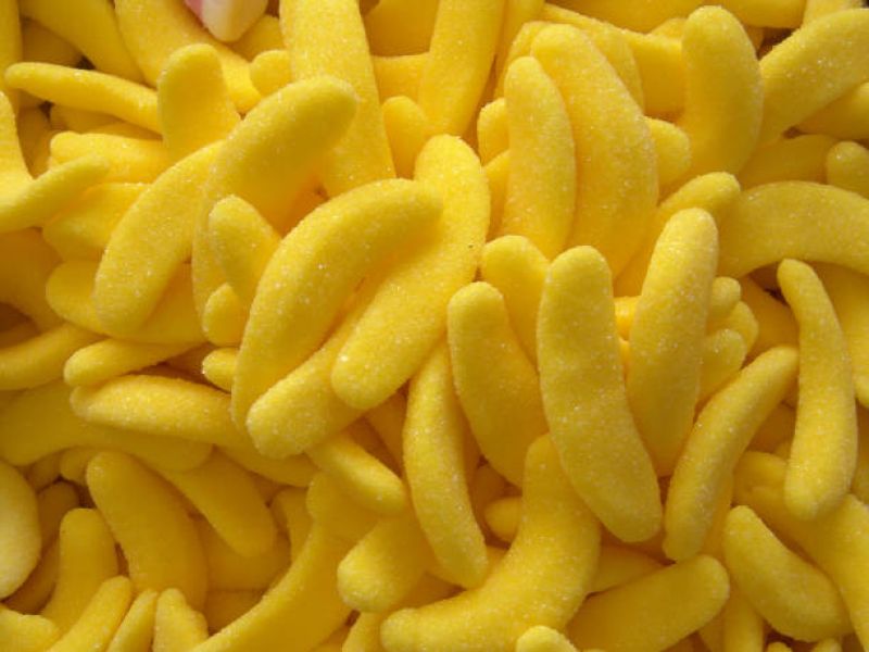 Bananas con azúcar. Caramelo de goma Ingredientes.: Azúcar, jarabe de glucosa, jarabe de azúcar, invertido, gelatina, gelificante, pectina, almidón, almidón modificado, maltodextrinas, dextrosa, acidulante, ácido citrico, ácido tartárico, ácido láctico, ácido malico, ácido acético, proteina hidrolizada de arroz, proteína de patata , humectante. glicerina, sortibotles, zumo de manzana a partir de concentrado, corrector de acidez, citratos de sodio, malatos de sodio, agente de recubrimiento : cera carnauba, cera de abejas, concentrado vegetal , limón, , cártamo, zanahoria, grosella negra, rábano, calabaza, manzana, tomate, boniato, cereza, espirulina, hibisco, suco, aceite de oliva, aromas y colorantes E110, E129. Alérgenos: SIN GLUTEN. Tags.: golosinas, bananas.